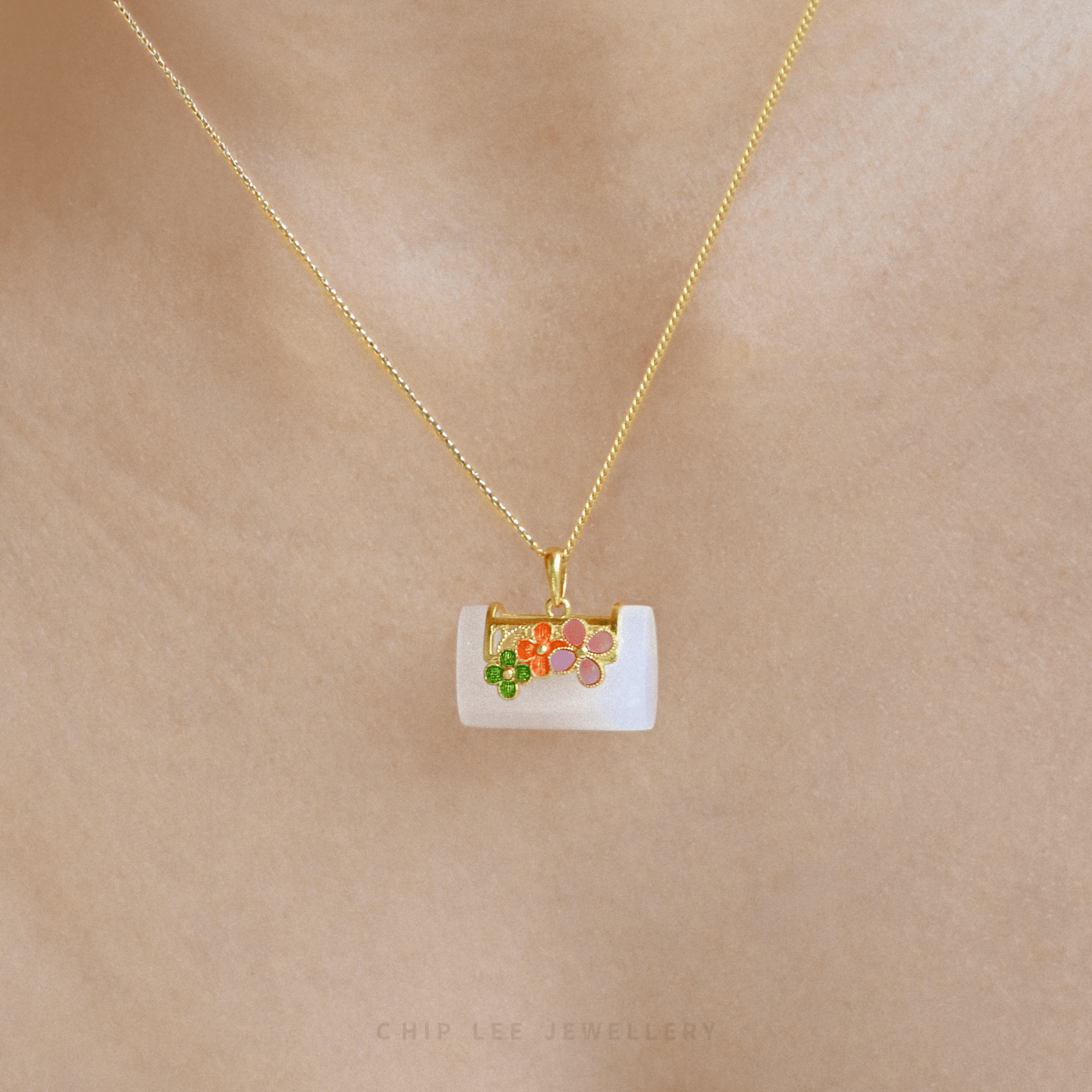 A dainty treasure, featuring 999 Pure Gold Floral Lock He Tian Jade Pendant. In Chinese culture, it is said that when good fortune comes your way, the moment you feel it, you should “lock in the good fortune". Wear this pendant and carry blessings and positive energy wherever you go.