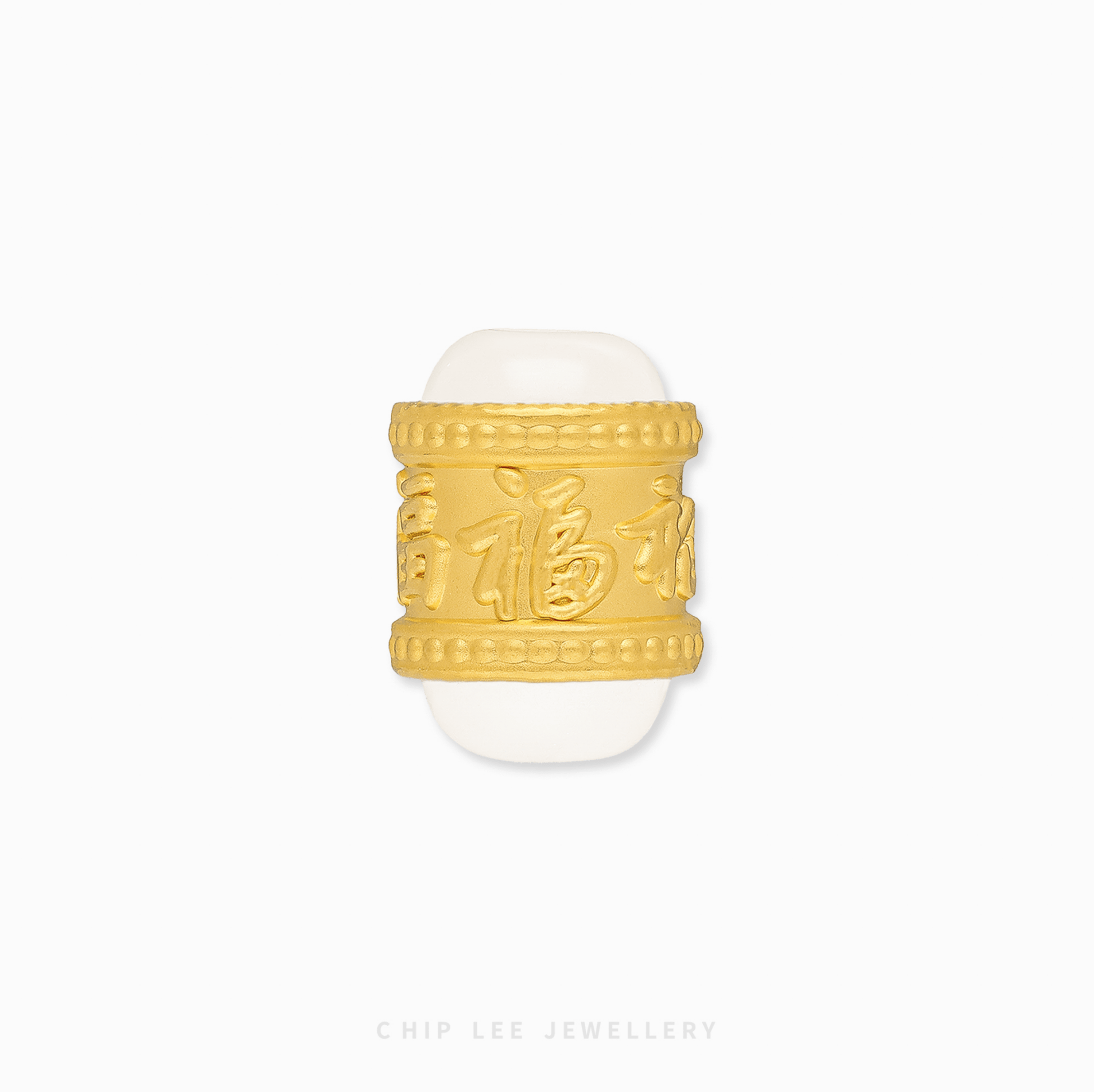 The 999 Pure Gold Fu (福) He Tian Jade Pendant features the Chinese character "福" (Fu), symbolizing good fortune and blessings, elegantly crafted in 999 pure gold. Set against a backdrop of He Tian jade, this pendant embodies prosperity and traditional craftsmanship.