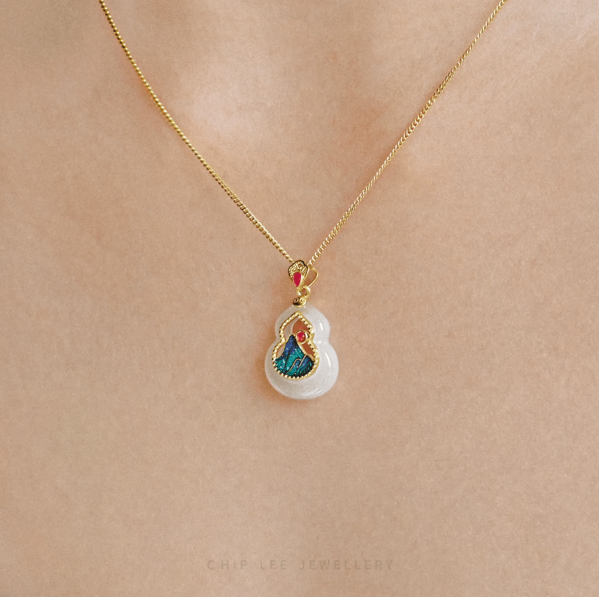 Set against the calming depth of 999 Pure Gold Mountain Blue He Tian Jade Pendant, the gourd motif symbolises health, longevity and protection. The mountains embody a firm foundation and resilience, while the sun signify vitality, energy, and renewal. Making it a meaningful and timeless statement piece.