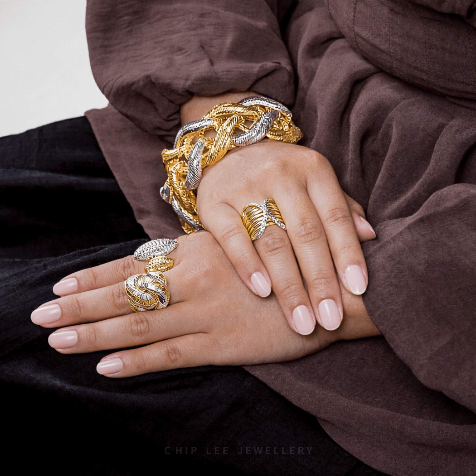 Navigate the city in style with the Duo Tone Criss-Cross Ring, symbolising the beautiful intersection of your unique life experiences. This edgy silhouette perfectly complements urban-chic fashion, adding a sophisticated golden glow to your daily luxury.